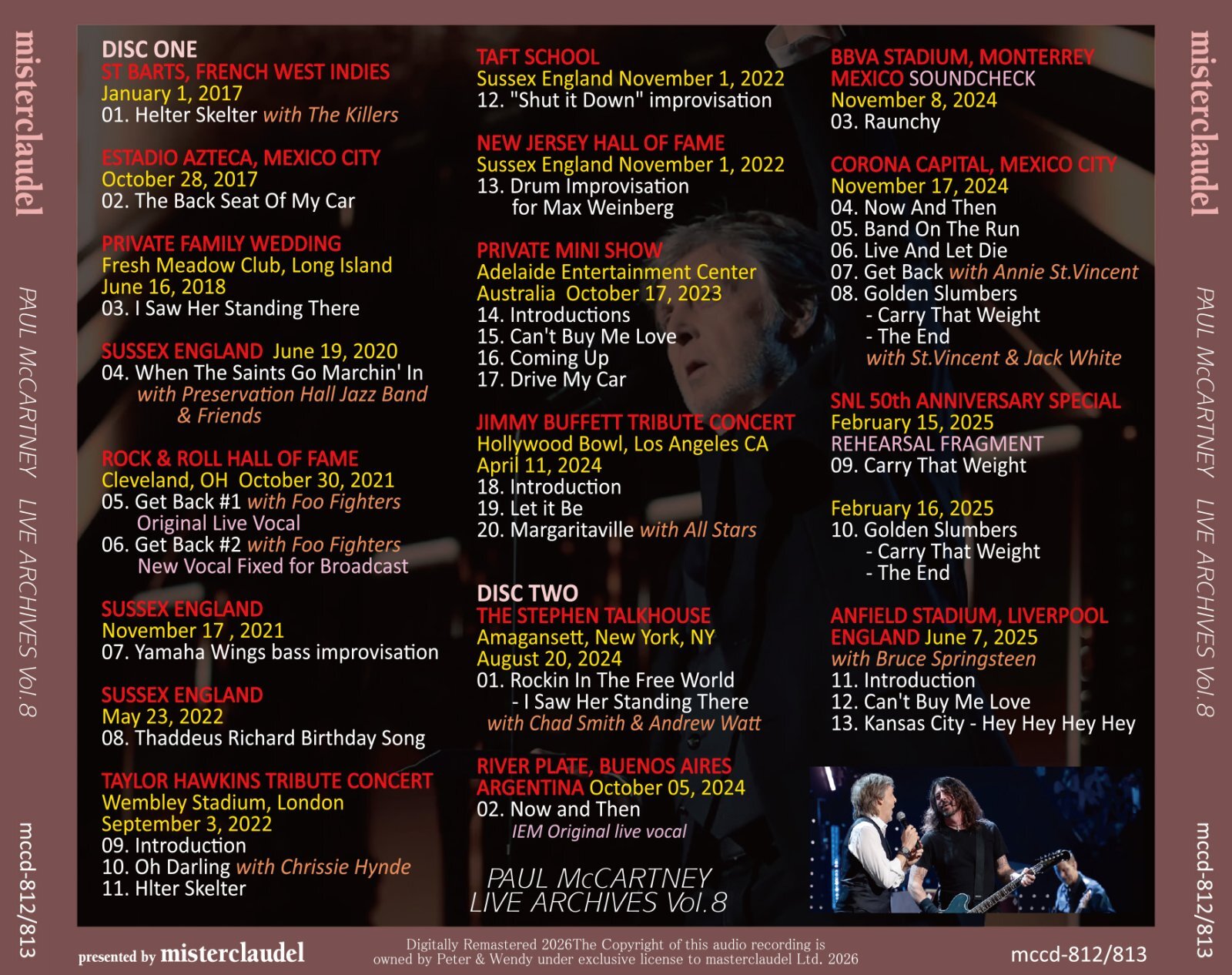 キラーズやフーファイターズらとの共演もあらば、どうしてこんなものが収録されているんだという身内の結婚式での演奏、プライベート・パーティなどの演奏も収録されている。ディスク1のトラック2の「Back Seat Of My Car」は歌詞に"メキシコ・シティ"が登場するので演奏したのであろう。ほんの触りだけだが、サウンドチェックではなくコンサート本編で演奏された唯一のテイクである。「Oh Darling」はビートルズ解散後、ライヴ演奏した唯一のテイク。ステファン・トークハウスではニールの「Rockin' In The Free World」から「I Saw Her Standing There」に繋げるという、やや強引なメドレーも面白い。美しいピクチャー・ディスク仕様の永久保存がっちりプレス盤。日本語帯付。