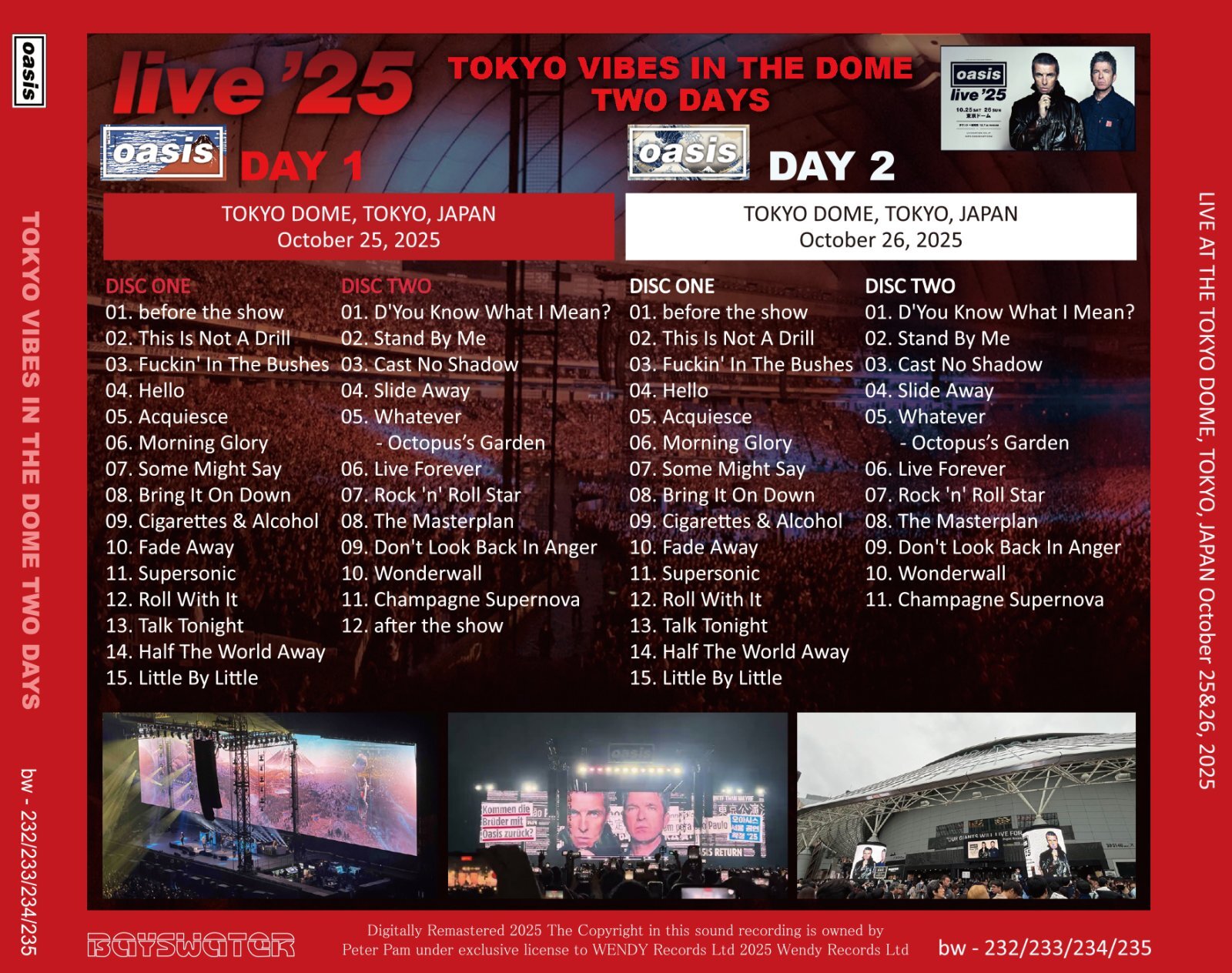 16年ぶりの来日、2025年10月25日と26日東京ドーム公演の両日を高音質で完全収録。非常にバランス良く収録されており、いずれも決定盤との呼び声が高い名録音である。デジタル録音では理論上ありえないのだが、不思議な事に録音によって微妙にズレが生じる。なのでオーディエンス音源を複数重ねると、リアムが2〜3人で歌っているようなヘンテコな音、不自然な音になる。優れた単一音源が最も良い音だというのは本作を聴けば理解出来る。
